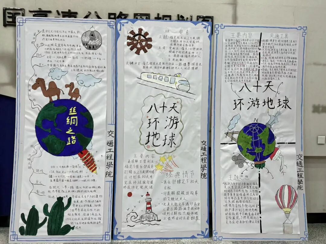宣传板报围绕《八十天环游地球》《丝绸之路:一部全新的世界史》等名著,聚焦“工程智慧与人文精神”核心主题,由我院学生耗时多日、分工协作完成。创作过程中,学生们以手绘插画,如骆驼、热气球、地球等元素,结合文字解析的形式,生动呈现名著中交通文化的历史脉络与精神内涵,整体设计兼具专业性与艺术性,旨在引导我院学生从经典名著中感悟交通工程的学科价值,激发专业学习热情。