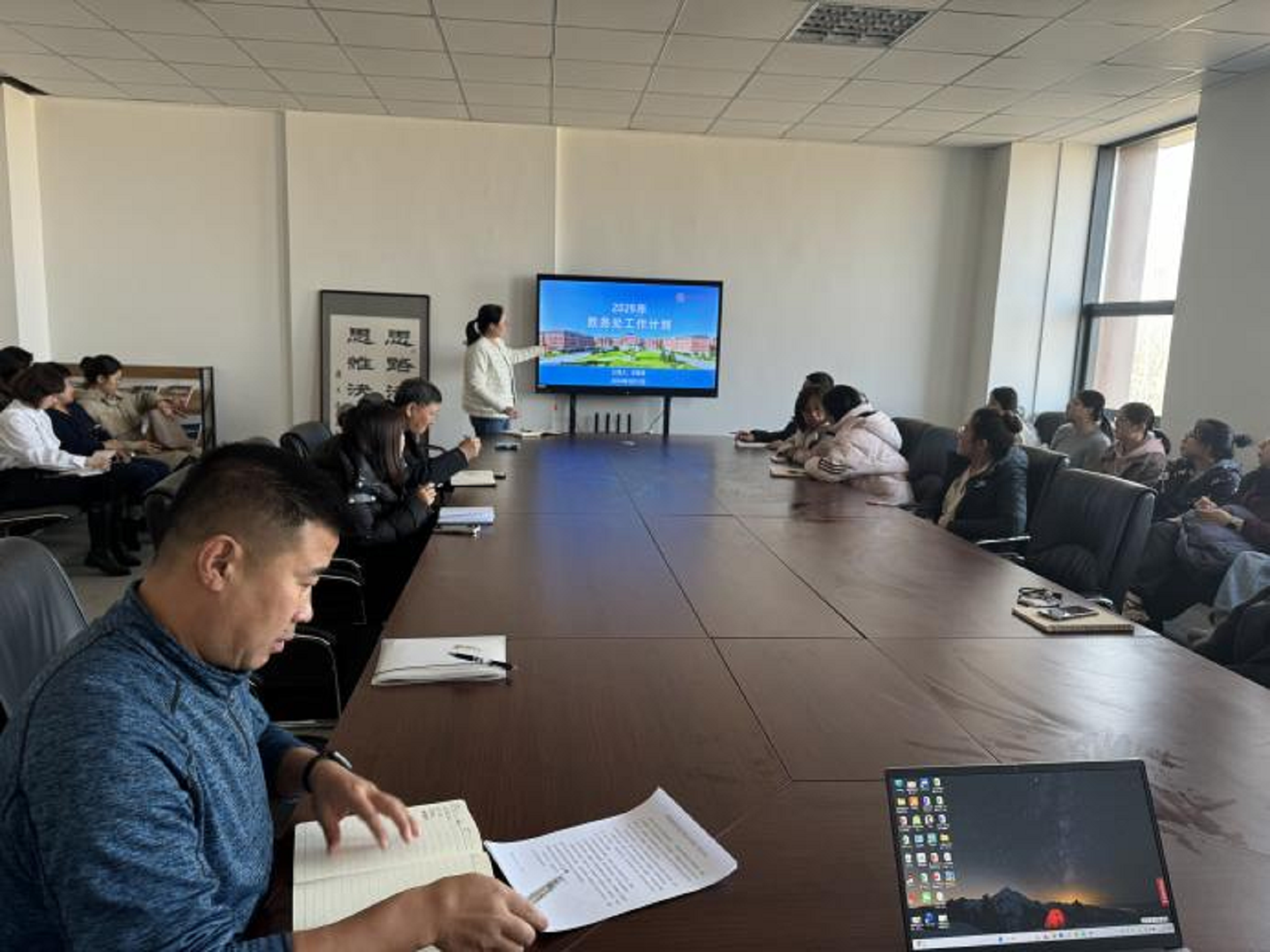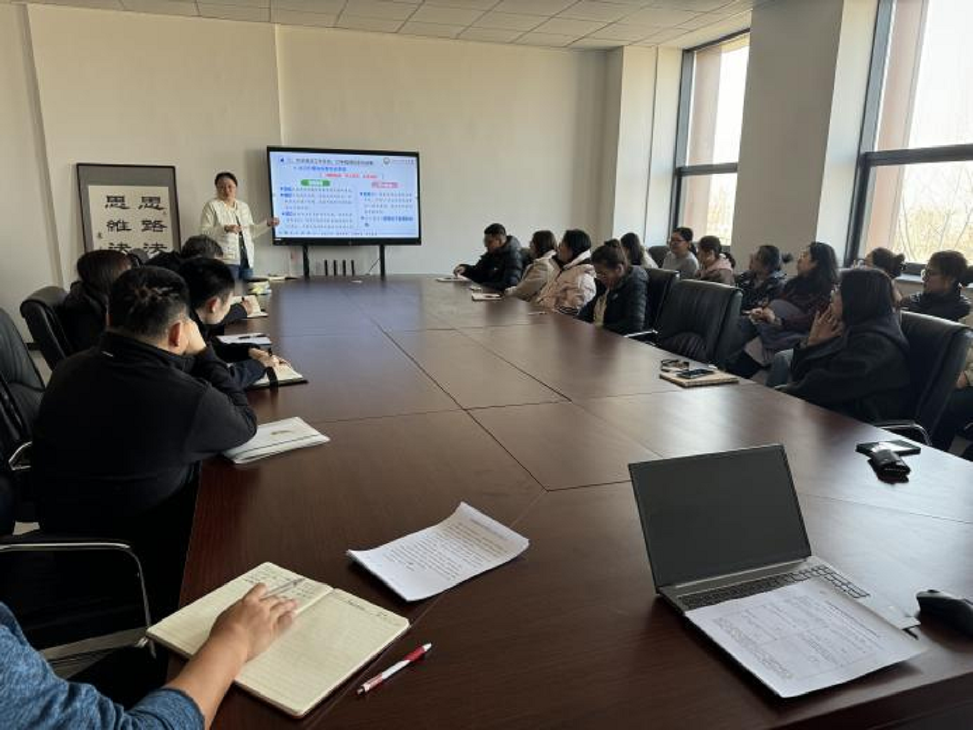 会议首先强调要严抓教学管理规范,保障教学根本任务。付静主任指出,规范的教学管理是提升教学质量的基础,全体教师需严格遵守各项教学规章制度,确保教学秩序平稳有序。在基础教学资料建设方面,会议要求认真做好资料归档工作,重点包括授课计划、教学大纲、教案以及试卷等关键教学文件的整理与保存,确保教学档案的完整性和规范性。会议提出要积极筹备省级教学成果奖,认真总结教学经验,凝练特色,提升成果质量,力争在省级教学成果奖评选中取得突破。