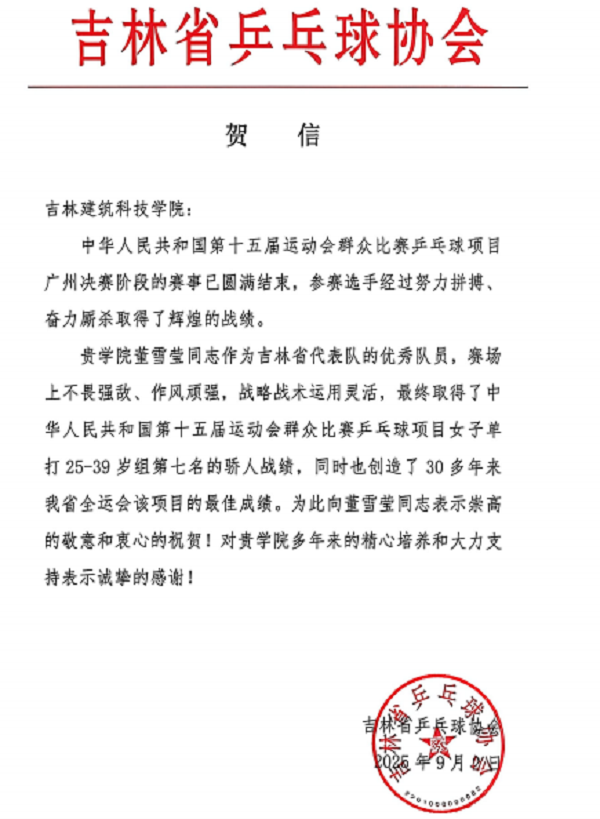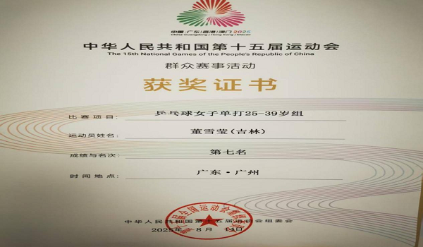 近日,备受瞩目的中华人民共和国第十五届全国运动会群众比赛乒乓球项目圆满落幕。在8月8日至8月14日的激烈角逐中,我校教师董雪莹代表我省出征,凭借精湛的球技、顽强的斗志以及稳定的发挥,一路过关斩将,最终荣获女子单打25-39岁组第七名的优异成绩,为我省、我校赢得了荣誉,充分展现了新时代教育工作者奋勇拼搏、永不言弃的精神风貌。