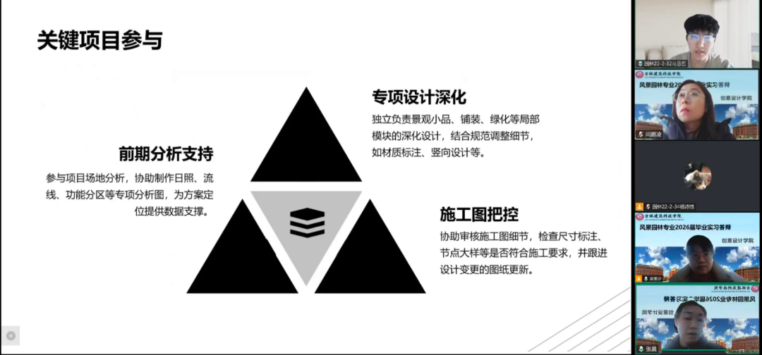 会议首先开展了毕业实习总结交流与答辩。学生通过腾讯会议依次汇报实习单位、岗位内容、工作收获及实践体会,重点分享了在方案设计、现场调研、图纸表达、沟通协作等方面的学习成果。会上,毕业实习指导教师对实习过程中表现突出的优秀实习生姚佳怡、刘天祎、孔瑞琪、吴晓庆等同学给予了充分肯定和表扬,这些同学能够主动适应岗位要求,认真完成实习任务,在专业能力、责任意识和综合素养等方面表现突出,展现了风景园林专业学生良好的精神风貌和扎实的实践素养。