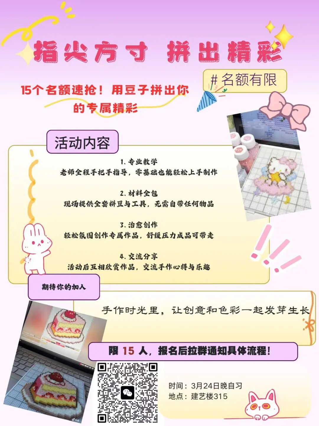招募15名学生参与拼豆手作活动,带领人员手把手教学,各色拼豆+全套工具准备就绪,一站式体验,在手作过程中得到心灵滋养。
