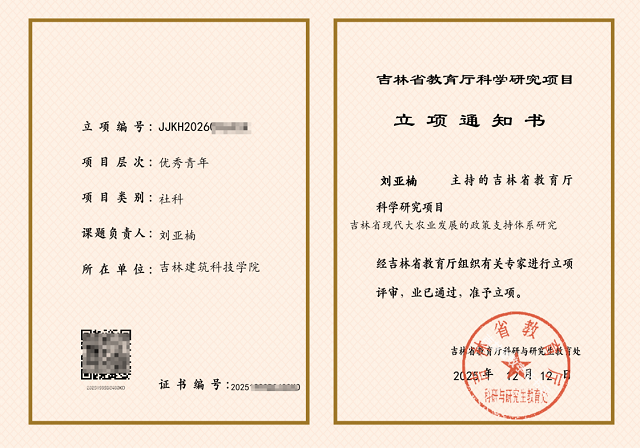 近日,吉林省教育厅公布2026年度科研项目立项名单。我院刘亚楠老师申报的优秀青年项目《吉林省现代大农业发展的政策支持体系研究》成功获批立项。