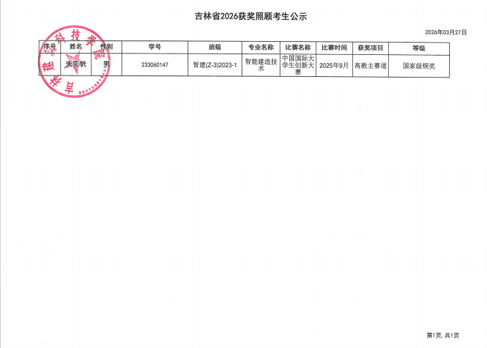 朱奕帆,男,智能建造技术2023级-1班,该生于2025年09月参加中国国际大学生创新大赛(高教主赛道)荣获国家级铜奖,现予以公示,公示期三天。