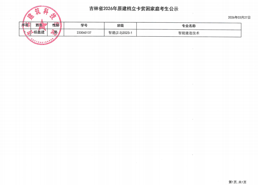 杨鑫建,男,智能建造技术2023级-1班,该生为建档立卡贫困考生,现予以公示,公示期三天。