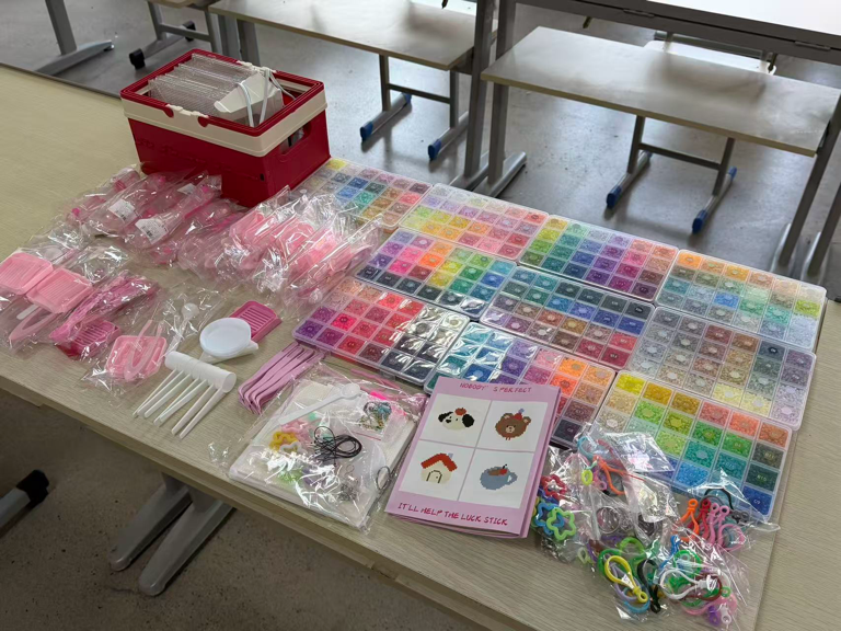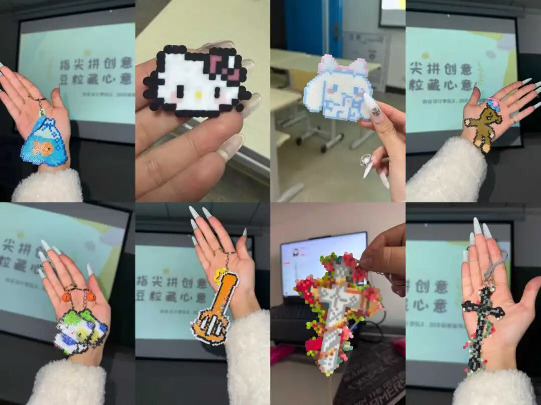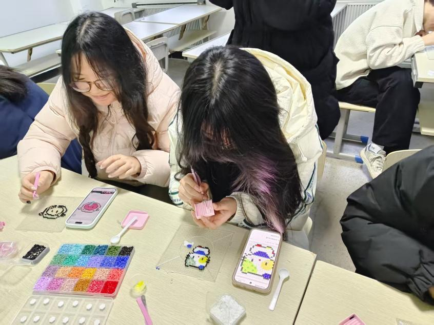 从空白模板到完整作品,每一颗拼豆都藏着耐心,每一件成品都带着心意。可爱的图案、治愈的色彩、默契的陪伴,让整个现场充满轻松温暖的氛围。同学们在动手创作中放松心情、释放压力,也在互相帮助中收获快乐与友谊。