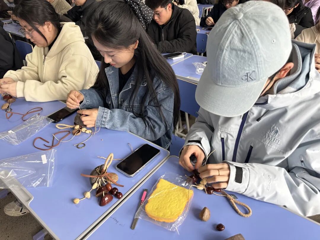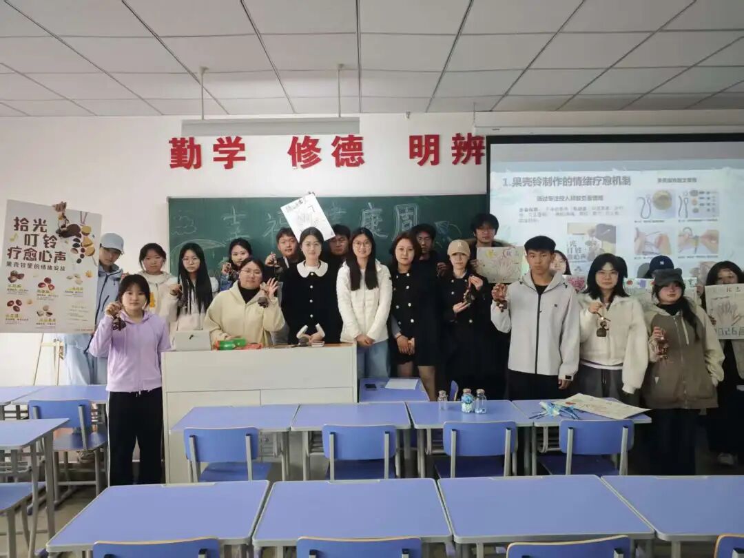 手工创作的独特之处在于,它将抽象的情绪疏导转化为具象的动手实践。同学们在沉浸式创作中暂时抽离学业与生活的压力,与自我展开安静而真实的对话。负面情绪在专注中被温柔转化,每一件独一无二的果壳铃,都成为创作者内心世界的隐喻表达。活动现场,同学们在交流创意、互帮互助中打破隔阂,构建起温暖而有力的同辈支持网络。