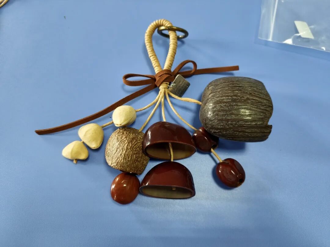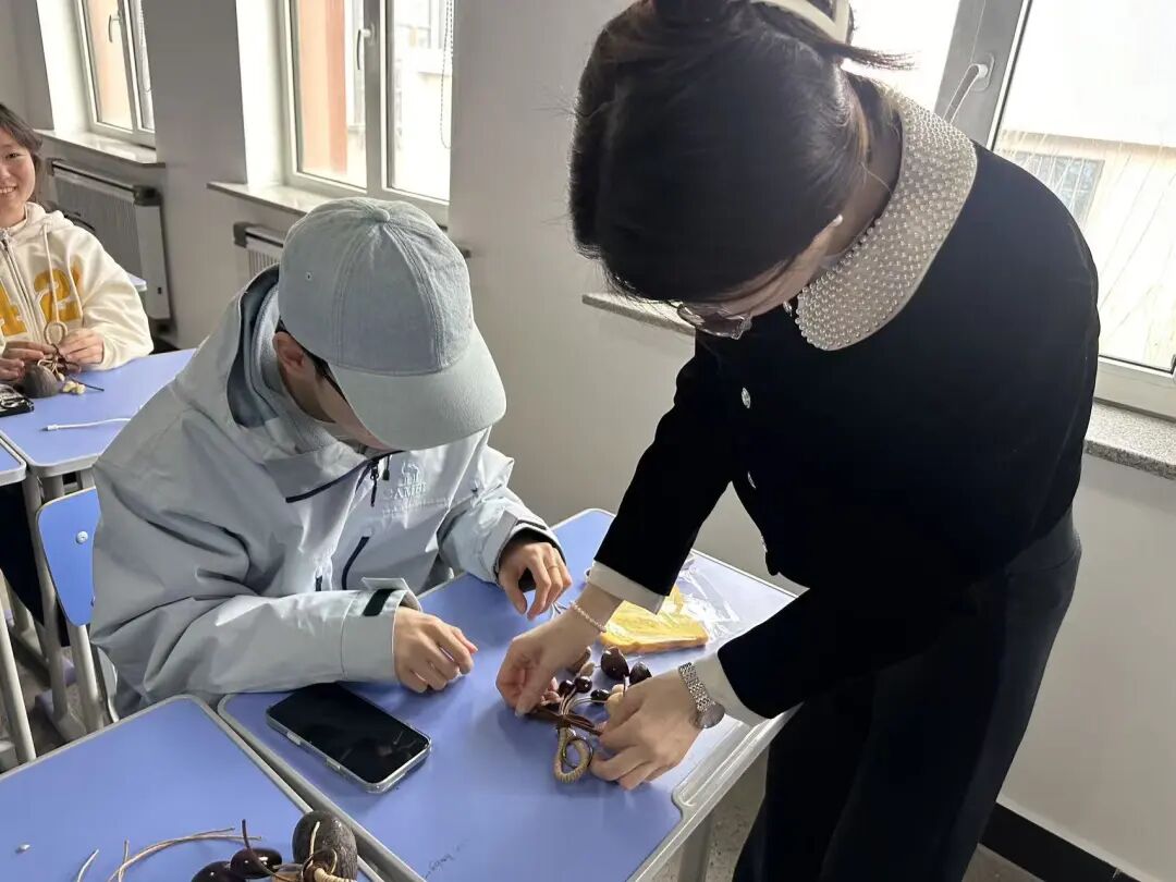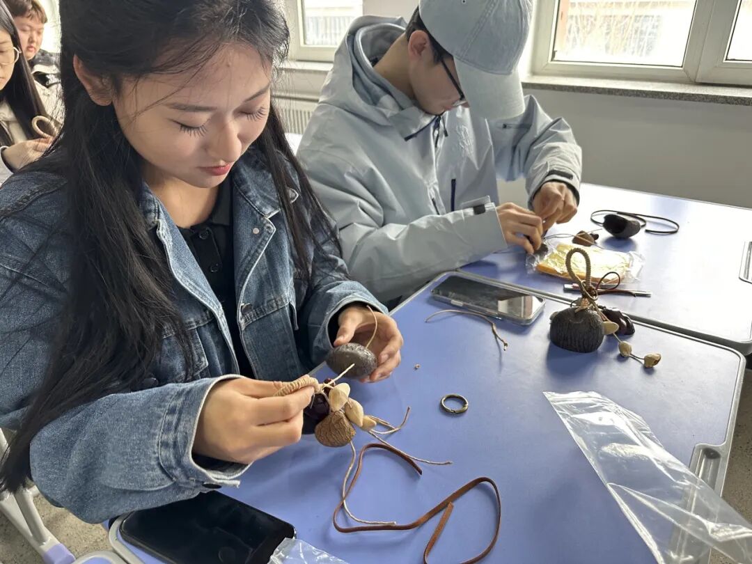 与以往单纯以讲座为主的心理健康教育形式不同,本次活动的核心环节——果壳铃手工创作,充分体现了“艺术疗愈”的教育理念。鸭腱藤、印尼黑果、夹竹桃等天然果壳在同学们手中被赋予新的意义。在“选壳—排列—烧绳串壳—打结固定”的细致流程中,指尖的专注成为内心秩序的延伸,自然材料的触感与果壳铃的清脆声响共同构筑起感官与情感的双重疗愈空间。