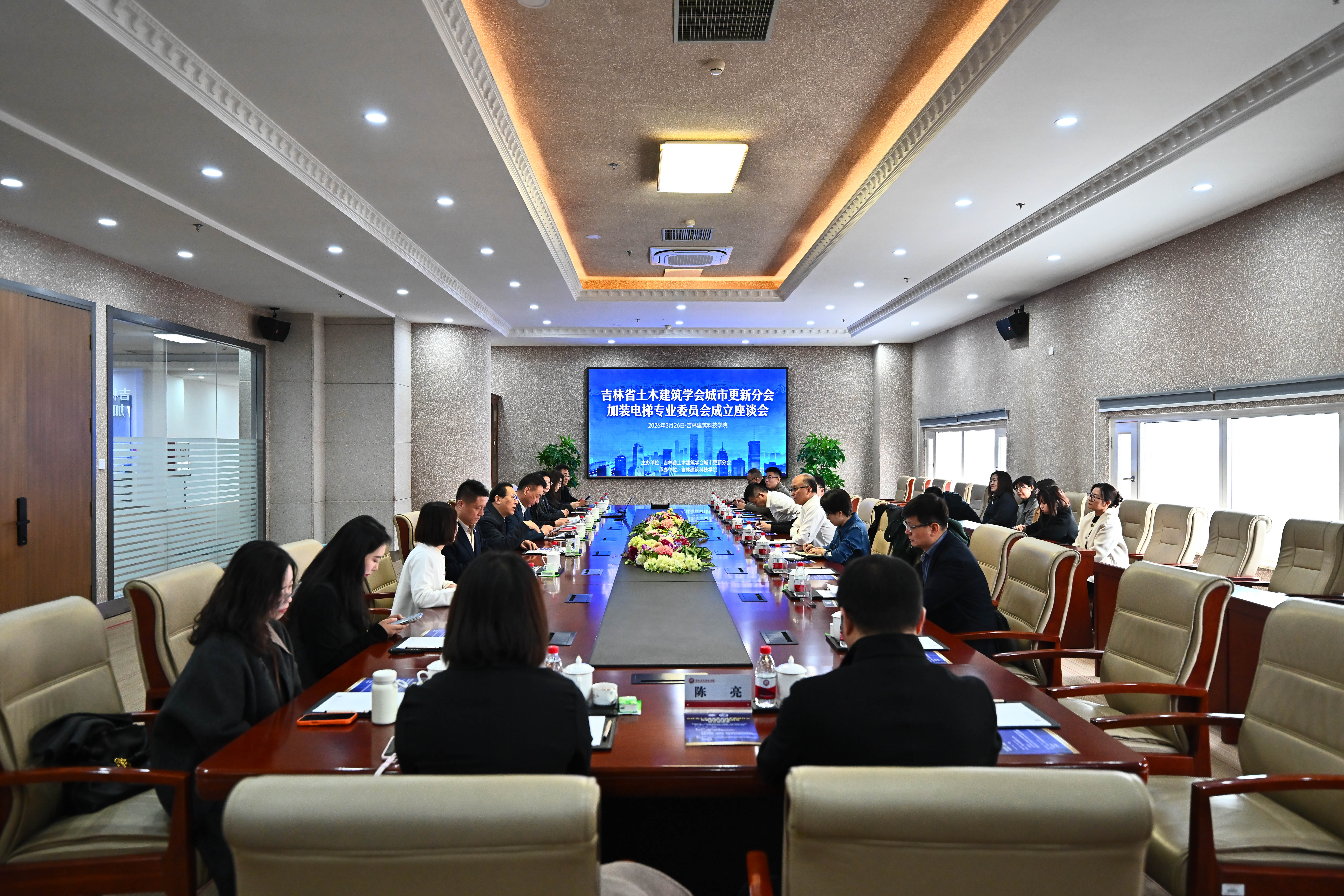 3月26日,吉林省土木建筑学会城市更新分会加装电梯专业委员会成立座谈会在吉林建筑科技学院举行。省住建厅总工程师刘强、科技处处长刘杨、加梯办主任齐际;吉林建筑科技学院校长杨晓东,常务副校长、吉林省土木建筑学会理事长窦立军,党委副书记、副校长刘春宇;企业代表、行业专家与高校代表参加会议。会议由城市更新分会会长吕静主持。