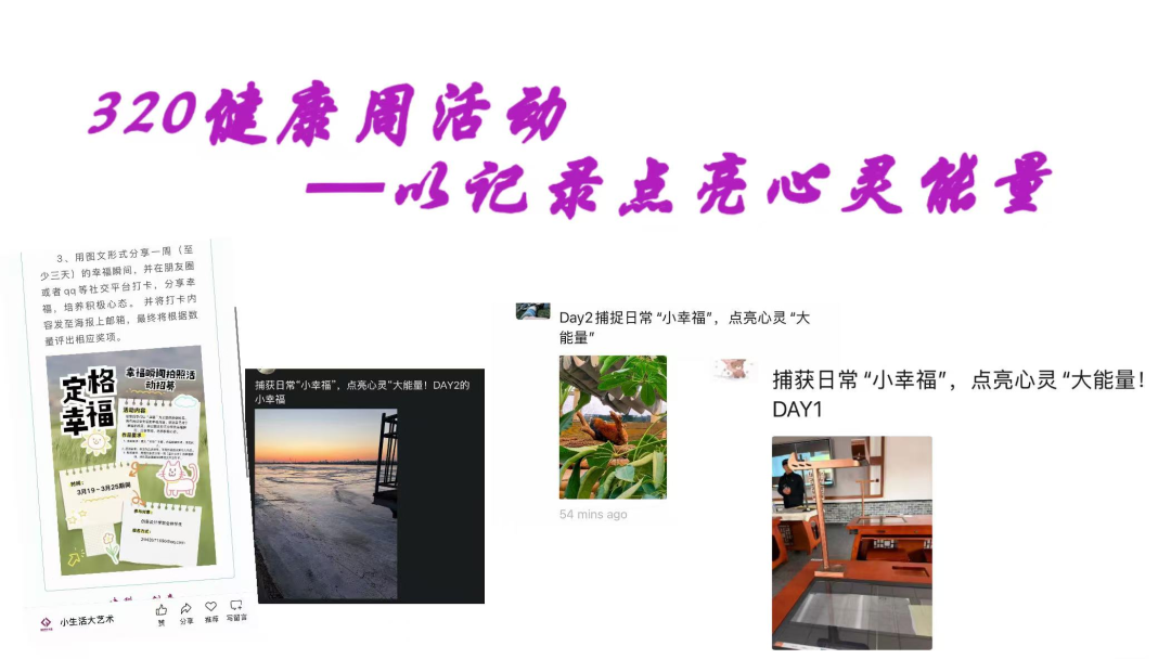 捕捉日常“小幸福”,点亮心灵“大能量”活动 征集同学们以“幸福”为主题的原创作品,用作品记录生活的幸福点滴,讲述自己对于幸福的感受。