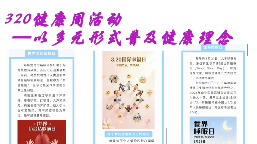 健康主题日宣传活动,充分利用学院公众号,为广大学生提供听得到、听得懂、听得进的宣传作品。以3.20国际幸福日、3.21世界睡眠日、3.24日世界防治结核病日为契机面向大众,以大学生喜闻乐见的形式,开展健康教育宣传。
